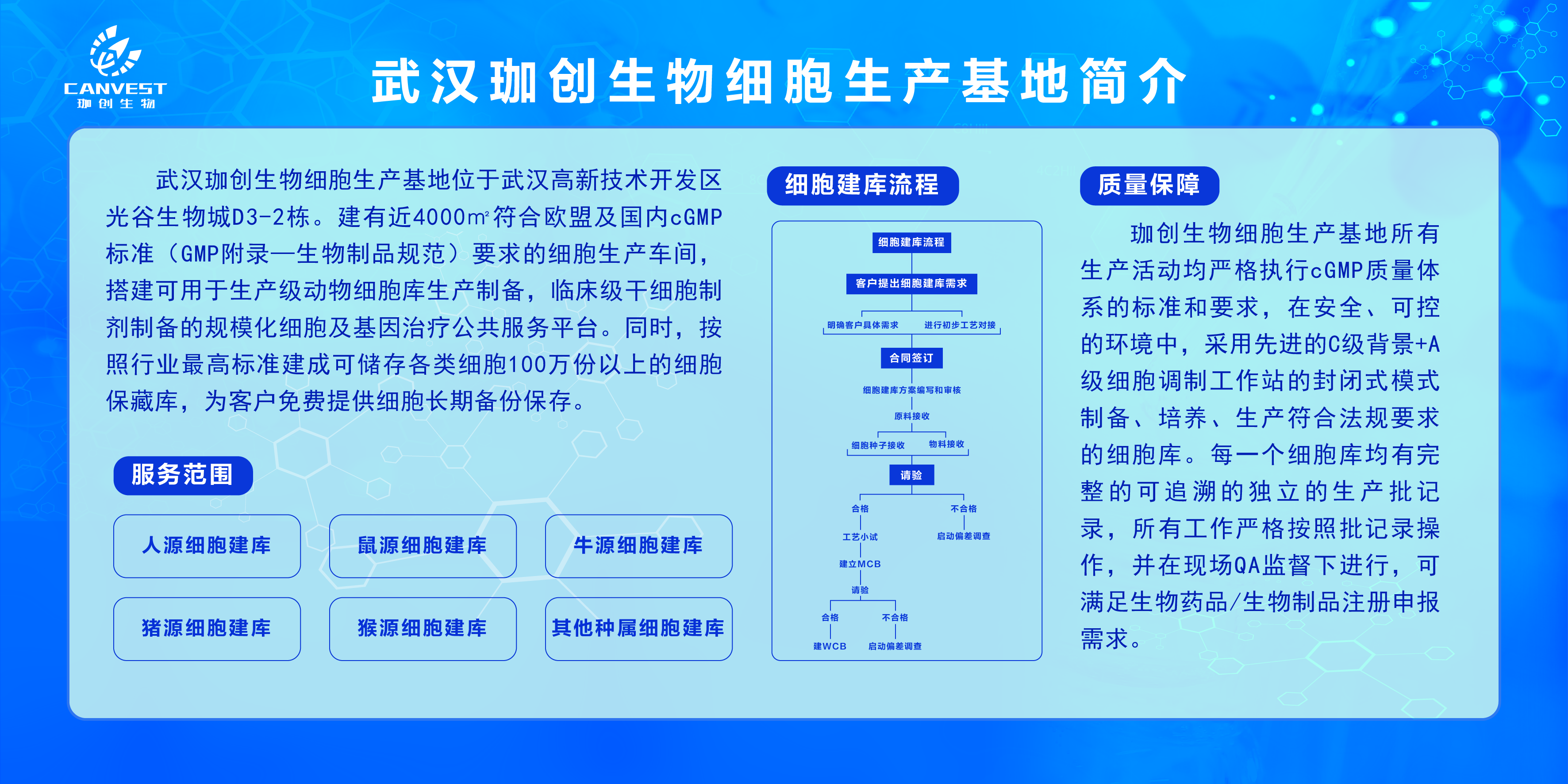 武漢珈創生物細胞生產基地位于武漢高新技術開發區光谷生物城D3-2棟。 建有近4000m2符合歐盟及國內cGMP標準(GMP附錄——生物制品規范)要求的細胞生產車間,搭建可用于生產級動物細胞庫生產制備,臨床級干細胞制劑制備的規模化細胞及基因治療公共服務平臺。同時,按照行業最高標準建成可儲存各類細胞100萬份以上的細胞保藏庫,為客戶免費提供細胞長期備份保存。