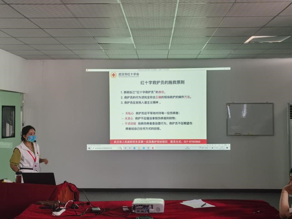 武漢市紅十字會工作人員分別采取理論講授與實際操作相結合的方式為大家講解了救護概念、心肺復蘇知識、AED使用講解、氣道異物梗阻現場救護等應急救護內容。
